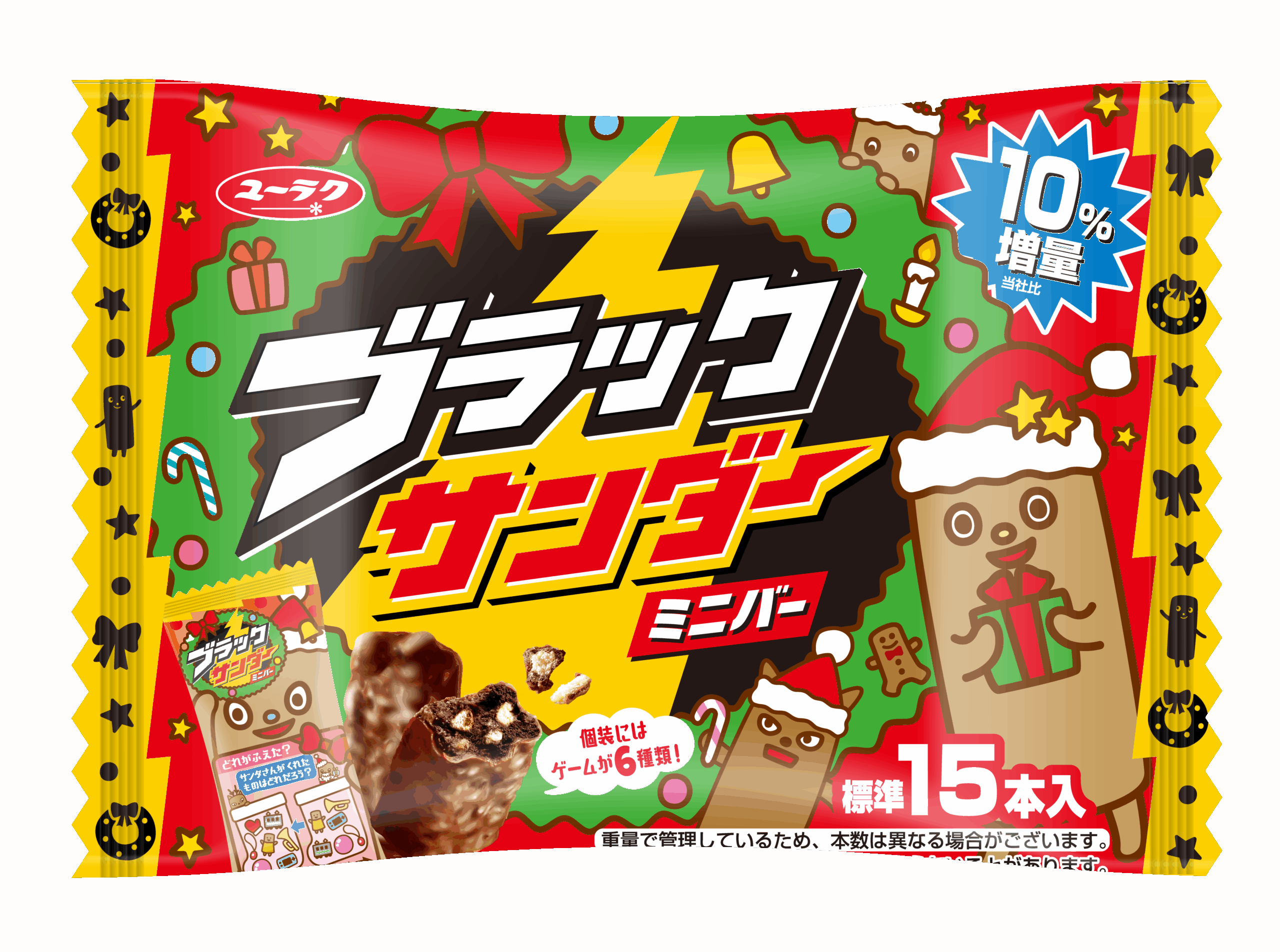 今年もパッケージデザインや個包装のゲーム内容を改良しパワーアップした「ブラックサンダーミニバー クリスマス」で、手軽で楽しいクリスマスをお過ごしください♪