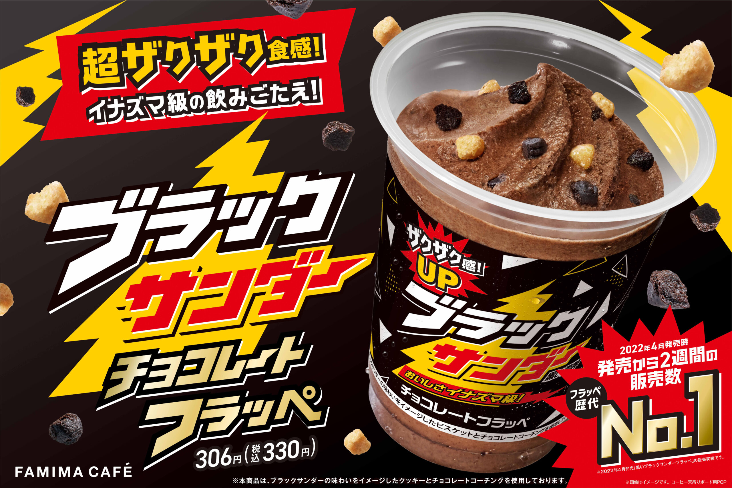 ファミリーマートの歴代販売数No.1「フラッペ」(※1)が復活!! ザクザク感がさらに進化!イナズマ級の飲みごたえ!! 「ブラックサンダー チョコレートフラッペ」