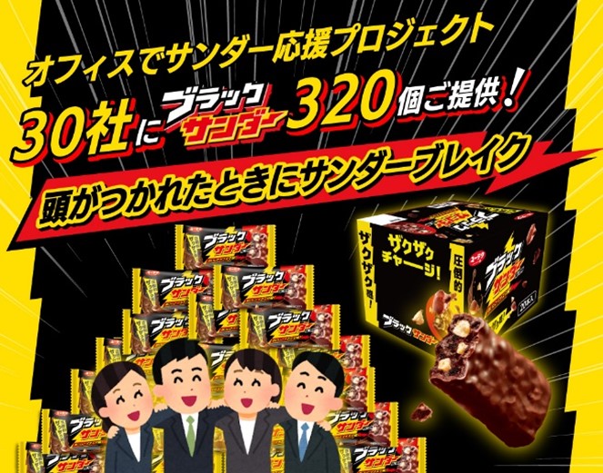 企画概要:仕事で頭がつかれたとき、ひと踏ん張り前などちょっと気持ちを上げたいときの休憩に、ブラックサンダーのザクザク感がぴったりです。一緒に働く同僚や上司のみなさまと一緒に食べたり、それぞれの働くスタイルに合わせてお楽しみいただけます。実際に仕事中の休憩にブラックサンダーを食べていただきたいと思い、職場にブラックサンダーを差し入れしてほしい企業(事業所)を募集しました。 ※現在は終了しております。