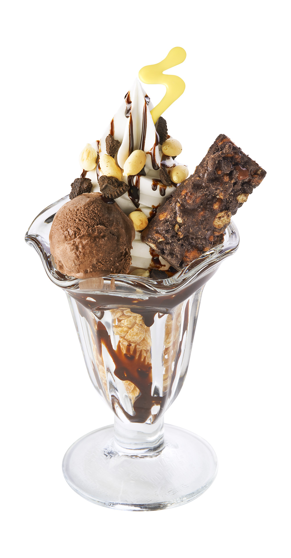 『ブラックサンダー イナズマチョコレートパフェ』は、チョコレートソースをトッピングしたソフトクリームの上にチョコレートアイスやチョコ掛け前のブラックサンダーをまるごと1本乗せた、大胆で豪快なパフェ。よりザクザク食感を味わっていただくために、ココアクッキーとプレーンビスケットをトッピングしています。仕上げには「ブラックサンダー」をイメージさせる、特製イナズマチョコレートをトッピング、見た目からも「ブラックサンダー」をお楽しみいただけます。