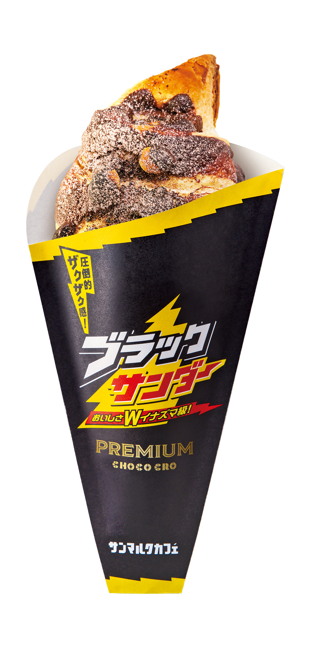 『ブラックサンダー ザクザクプレミアムチョコクロ』は、「ブラックサンダー」のような黒くてゴツゴツした見た目で、ザクザク食感のプレミアムチョコクロ。チョコ掛け前の「ブラックサンダー」、チョコクロ用チョコレートをそれぞれ1本ずつお馴染みのチョコクロの生地で包み込み焼きあげた後、外側には実際のブラックサンダーでも使用されているココアクッキーとプレーンビスケットをトッピングすることで、「ブラックサンダー」のようなザクザク食感と、ずっしりとしたチョコレートの濃厚な味わいを楽しめるメニューです。