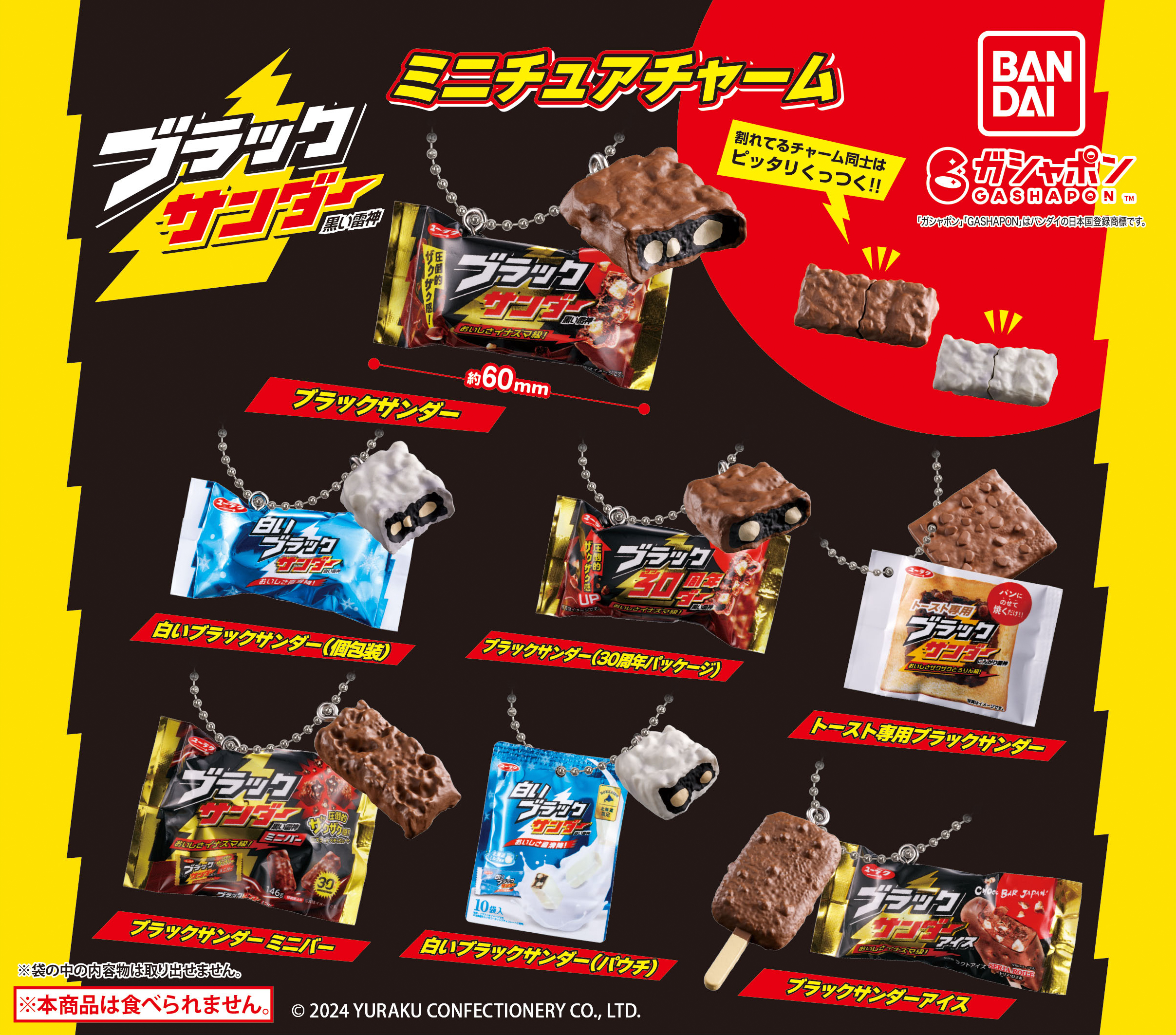 有楽製菓株式会社(本社:東京都小平市、代表取締役社長 河合辰信)が展開するチョコ菓子「ブラックサンダー」シリーズのガシャポン®「ブラックサンダー ミニチュアチャーム」(1回300 円・税10%込、全7種)が株式会社バンダイ (本社:東京都台東区)より、2024年12月第2週から全国のガシャポンバンダイオフィシャルショップ、玩具売場、量販店、家電店などに設置されたガシャポン自販機シリーズにて発売されます。