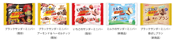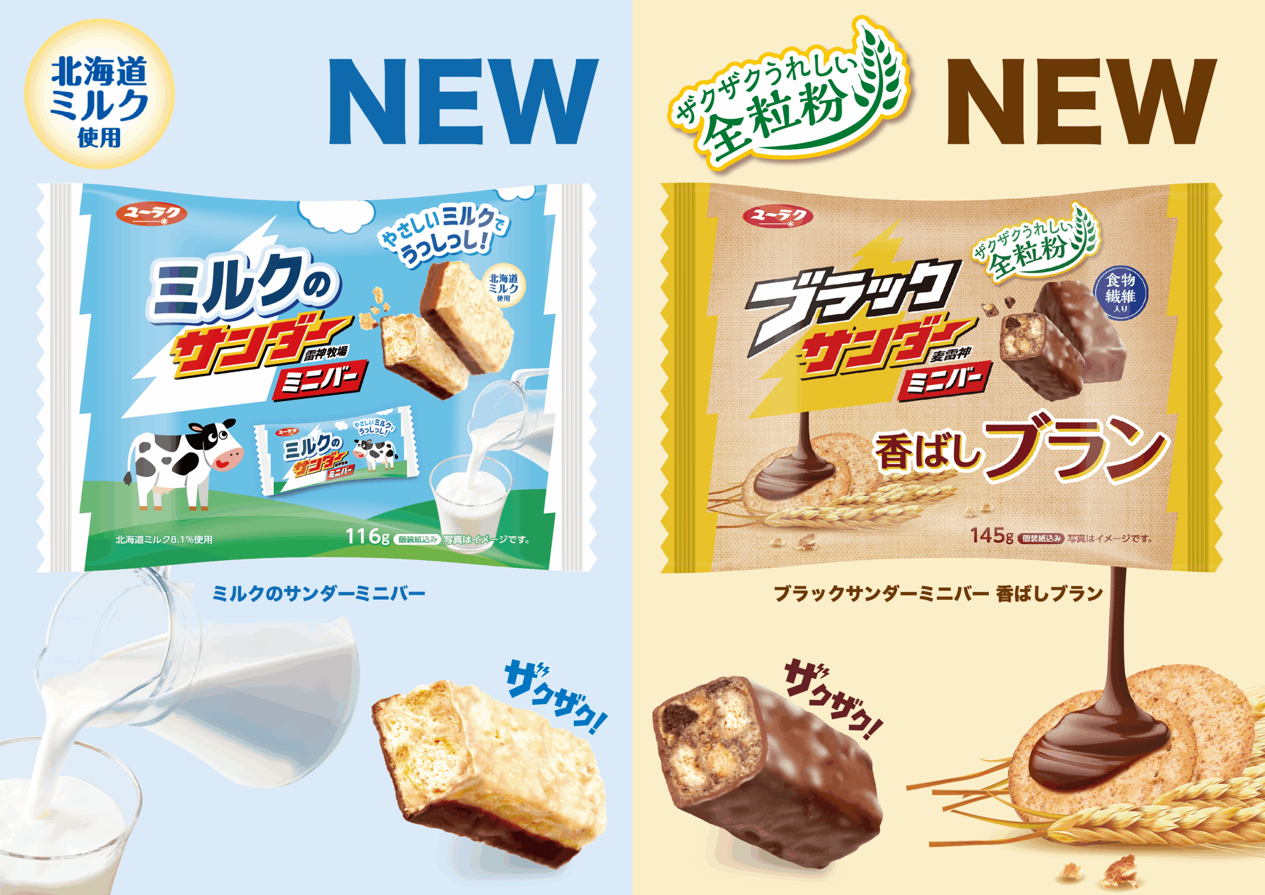 この度、新商品として「ミルクのサンダーミニバー」と「ブラックサンダーミニバー 香ばしブラン」を発売します。新しい仲間が加わり、さらにパワーアップしたブラックサンダーミニバーシリーズをお楽しみください。
